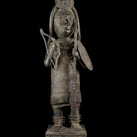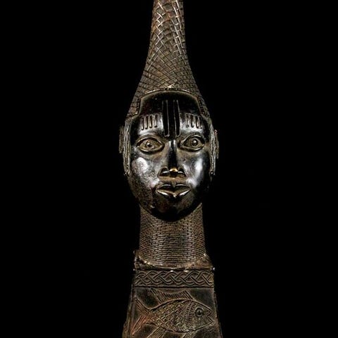 Bronze Kopf, en nigeriansk Yoruba-reproduktion af et mindehoved fra det XVIII. århundrede, i bronze, 4,2 kg, 37 cm h f h, 25 cm dyb, 20 cm bred. Klik på den blå "gå til varen" knap, for at købe eller byde på denne vare. Den samlede pris vil blive vist inden du afgiver dit bud.