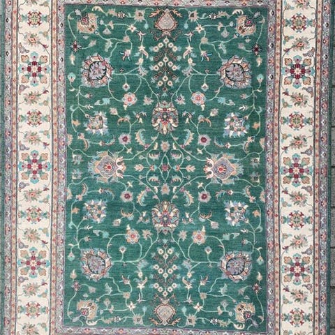 Højkvalitets håndknyttet designer-tæppe med særdeles fin knude og moderne, samtidig orientalsk-inspireret ornamentik. Den elegante petrolblå farve danner en rolig baggrund, mens de detaljerede motiver i varme røde-, guld- og cremetoner kunstfærdigt fremhæves.