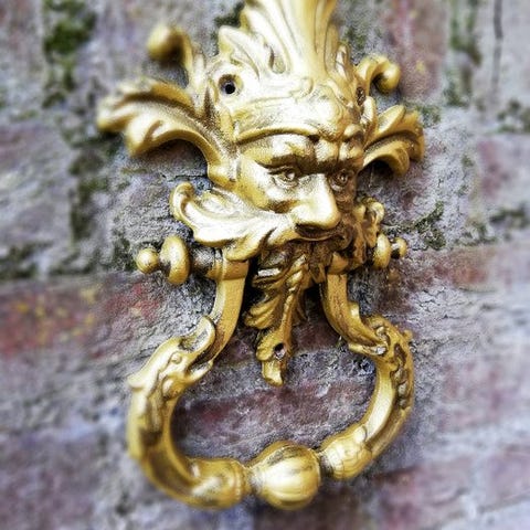 Smuk støbejernsdørhammer i form af et vædderhoved, forsynet med en bronze patina.