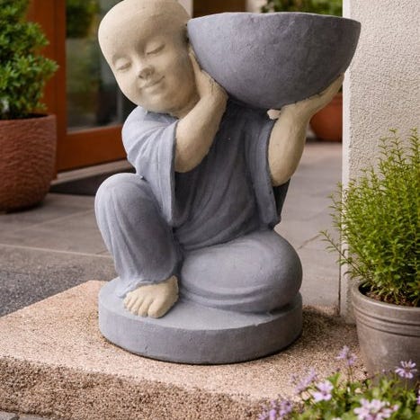 Elegant Buddha-figur fremstillet i resin af høj kvalitet, med en omhyggelig finish i gyldne og sølvfarvede nuancer, der simulerer en patineret aldring. Etdelen integrerer en praktisk frontal skål, ideel som frø- eller vandskål til fugle, og forener æstetik og funktionalitet i ét dekorativt stykke.
