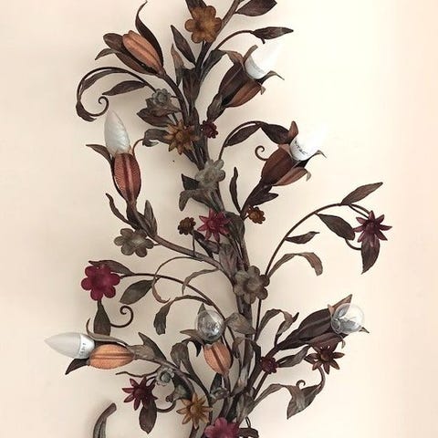 Elegant sæt bestående af 7 væglamper i forgyldt bronze, hver med to lys og oval skærm i lyst stof. Den raffinerede og tidløse stil gør dem ideelle til at indrette klassiske rum, indgange, gange, stuer eller repræsentationslokaler.