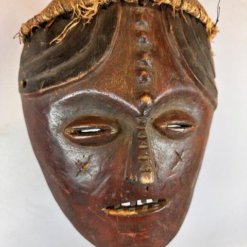 Mwana Pwo-maske fra Chokwe, oprindelig fra Angola med forbindelser til Kongo og Sambia, udskåret i træ med skaller og plantefibre, mørkebrun forside, dimensioner 37 × 27 × 27 cm, vægt 930 g, i rimelig stand. Klik på den blå "gå til varen" knap, for at købe eller byde på denne vare. Den samlede pris vil blive vist inden du afgiver dit bud.