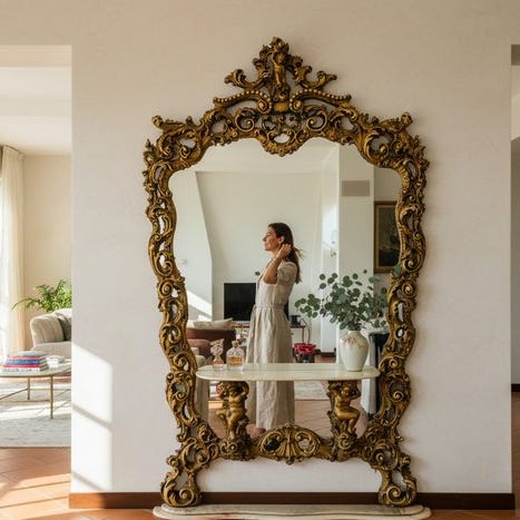 Rammen viser typiske rocaille- og bladmotiver med gennembrudte elementer og giver genstanden en særligt repræsentativ udstråling, ideel som stilfuld blikfang i klassiske interiører.