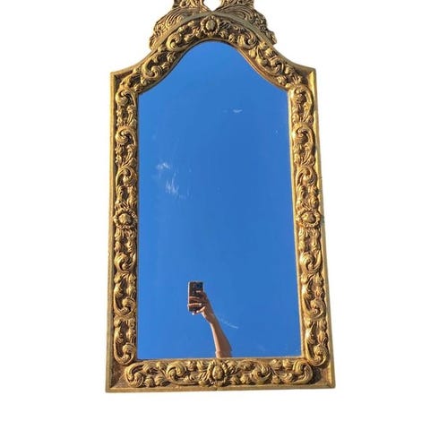 til salg står et dekorativt vægspiegel i barok stil med et udsøgt udskåret og gyldent indfatning af træ. Spiegelet imponerer med sin elegante, buede form og den detaljerede ornamentik.