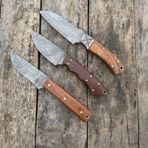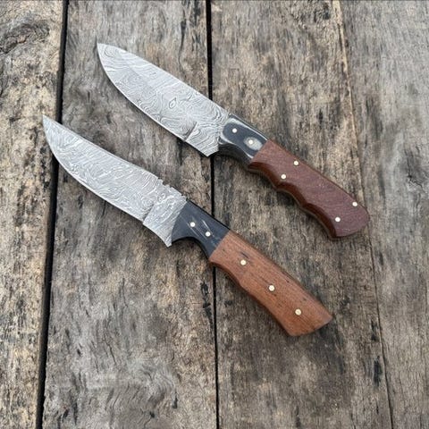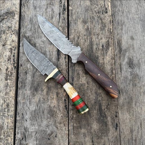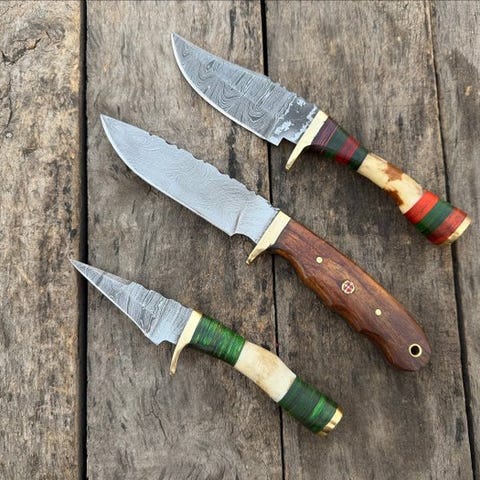 Dette er en bemærkelsesværdigt smedet og håndfastgjort køkkenkniv lavet af de fineste knivmagerne i United States. Dette er en meget smukt håndlavet Prestigious Custom Handmade Collectibles Knives, multi-lag smedet stål, træ- og gevirhåndtag, læderskede. kniven har et behageligt greb. Bladet er af særligt smedet stål med en høj skærekant. Denne kniv er både et samlerobjekt og et nyttigt køkkenredskab. De længste knive har en længde på cirka 27 cm.