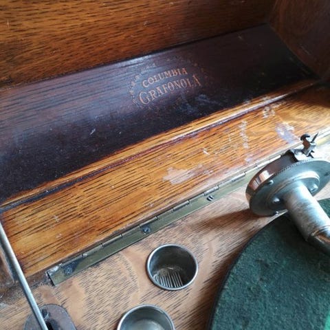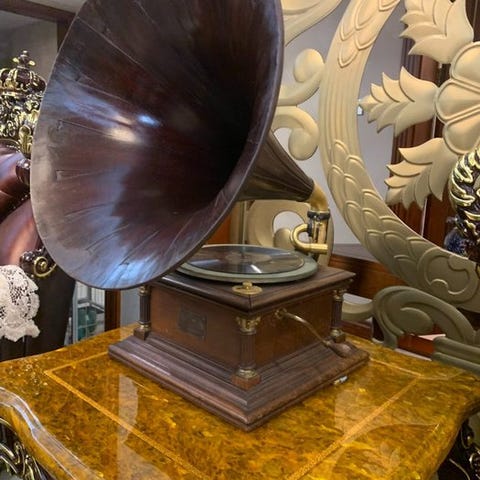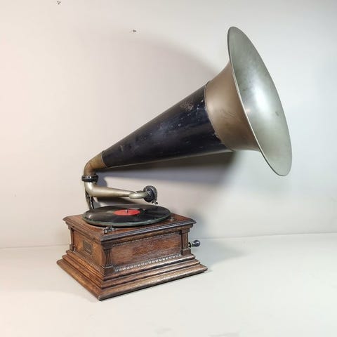 Smukt grammofon til 78 omdr./min., år 1920, tysk, fra det velkendte hus P.J. Richter & Zn, fuldt funktionsdygtig, alt renset og integreret af tekniker, mange udskiftelige nåle, membran til pick-up’en som ny, originalt tilbehør fra tiden, pladeblok (se foto), meget kraftfuld takket være massivt træ, helt små og ubetydelige tidsmærker, altid opbevaret i en ikke-ryger familie og i synsforsvar i udstillingsvindue. Pladen til visning IKKE til salg.