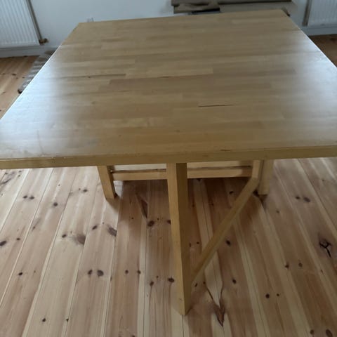 Spisebord i fyrretræ med klapfunktion. Bordet har rektangulær midterplade og buede klapender, som kan slås op og ned efter behov. Egnet som spisebord i køkken eller mindre spiseområde, hvor der er behov for fleksibel bordplads.