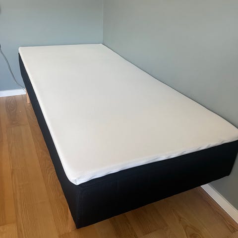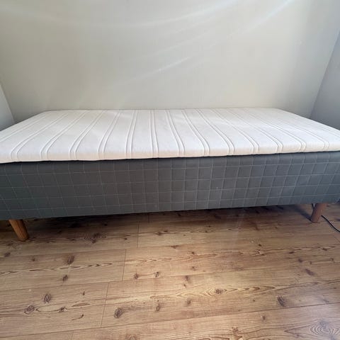 Boxmadras i enkeltstørrelse ca. 90x200 cm. Madrassen og sengerammen er betrukket med gråt stof. Sengen står på ben i metal, som giver fri plads under sengen til rengøring eller opbevaring. Velegnet som enkeltseng i soveværelse, gæsteværelse eller ungdomsværelse.