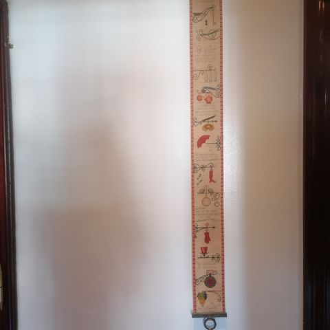 Broderet vægophæng med dansk tekst og forskellige motiver, blandt andet paraply, støvle, kobberkedel, lysestage og drueklase. Ophænget er udført på lys stof med røde kantborter og flerfarvet korsstingsbroderi. Egnet som dekorativ vægudsmykning i fx køkken, gang eller stue.