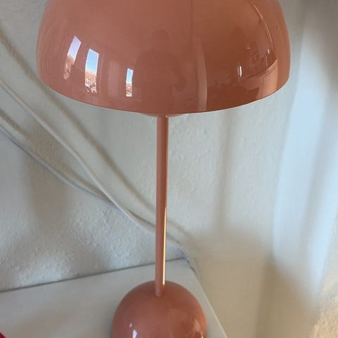 &Tradition Verner Panton bordlampe i grøn lakeret metal. Lampen har halvkugleformet skærm og rund fod med integreret tænd/sluk-knap. Den leveres med USB-kabel til opladning og kan anvendes som bord- eller stemningsbelysning i f.eks. stue, soveværelse eller på skrivebord.