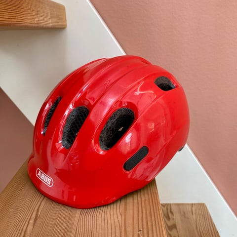 Abus Smiley 3.0 cykelhjelm i lilla med hjerter og stjerner. Hjelmen har ventilationshuller med net, justerbart spændesystem i nakken og kliklås under hagen. Indvendig polstring og orange remme. Velegnet som børnecykelhjelm til hverdagscykling og ture.