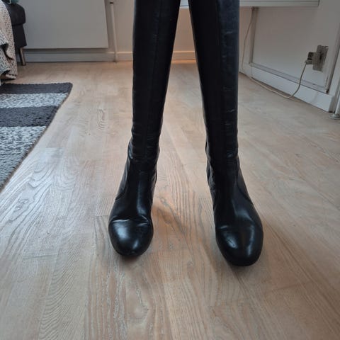 Knæhøje dame støvler i blødt sort læder i størrelse 41 - højde 46 cm. Støvlerne har lav hæl og lynlås bag. Ydersålen er i gummi med let mønster for bedre fodfæste. Enkle og klassiske læderstøvler, der kan bruges til hverdag og mere formelle anledninger. Meget lidt brugt.