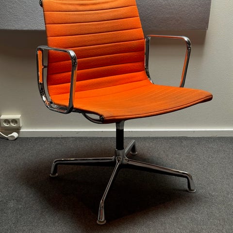Eames stol i rød læder med aluminium stel. Stellet har brugsspor, men læder står meget pænt. De sorte plastik fødder er udskiftet, da den ene knækkede. Stolen er fra 1997 og er blevet ompolstret af professionel tilbage 2010