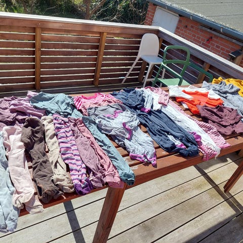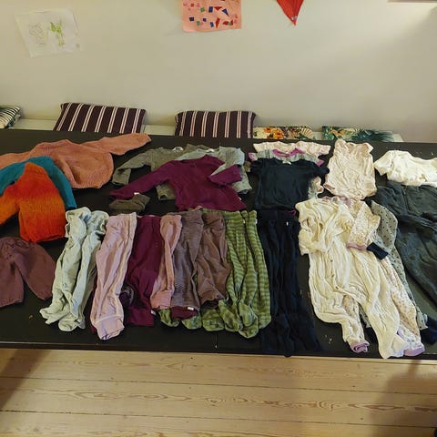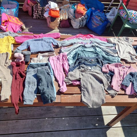 Uldpakke/tøjpakke, der er en masse lækker og elsket uld i størrelse 74, som godt kan bruges igen.
