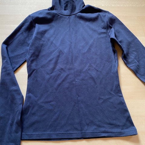 Langærmet bluse med høj hals i blå farve. Blusen har tryk på fronten og er velegnet som hverdagstøj eller som lag under anden beklædning. Materiale og mærke er ikke oplyst. Velegnet til køligere dage på grund af den lange ærmelængde og den høje hals.
