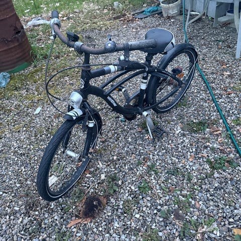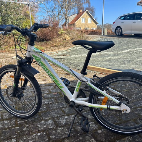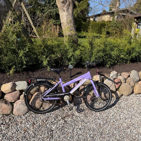 Winther børnecykel med 20" hjul i lys blå, lilla og hvid. Cyklen har lav indstigning, kurv foran og bagagebærer bagpå. Udstyret med kædeskærm, skærme, støtteben og 3 gear som vist er lidt stramme at skifte. Den har noget rust og skal pumpes.