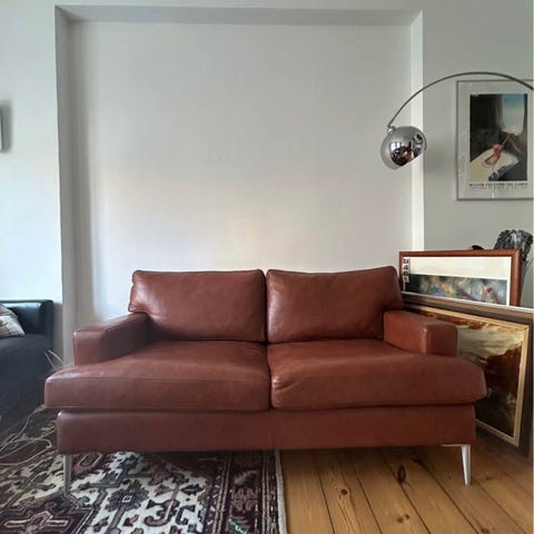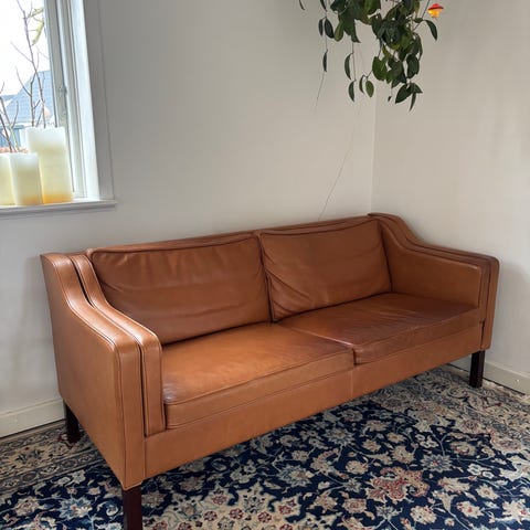 Marstrand sofa fra Ilva i cognac semianilin læder. Ben i sæbebehandlet egetræ. Nypris er 14.999 kr. Købt i september 2024.