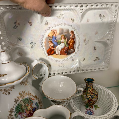 Bavaria vægplatter i porcelæn med romantiske figurmotiver i midten. Tallerkenerne har turkis kant med guldfarvet dekoration. Bagsiden er mærket Bavaria og monteret med metalophæng til væg. Velegnet som dekoration i fx stue eller køkken. Sælges som sæt.