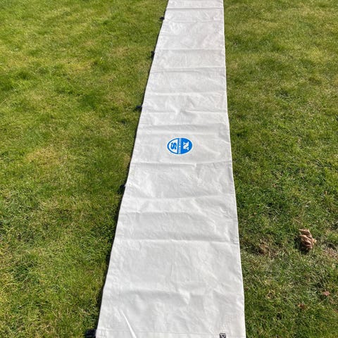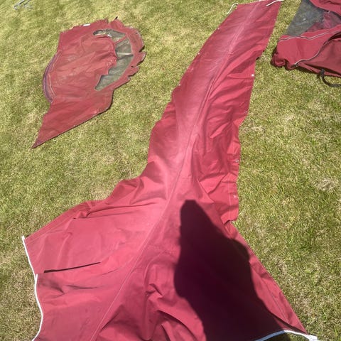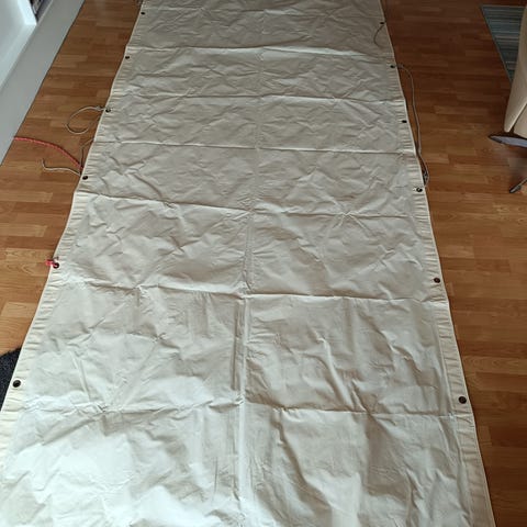 Blå/hvid-stribet bomtelt/solsejl, længde: 280 cm, bredde: 2 x 170 cm.