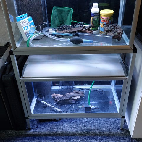 Sælger dette 160 liters (80x50x40) Akvastabil Move akvarie med porsabord, 2 led skinner, pumpe, 2 trærødder, foder, plantegødning, net, algemagnet og bundsuger.