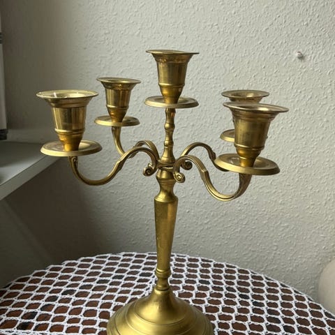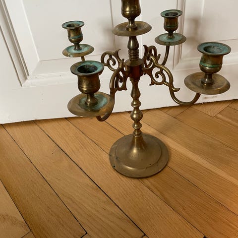 2x Smuk og dekorativ lysestage i klassisk, antik stil sælges. Fremstillet i metal (messing/bronzelook) med fine detaljer og elegant udformning. Kandelaberen har plads til 5 lys og står stabilt på en flot, ornamenteret fod.