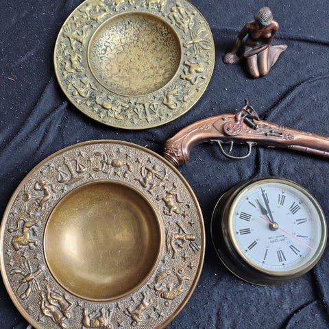 Ædel malmfad med reliefmotiv i længde 29, bredde 15. Rektangulært fad med opadvendte kanter og detaljeret figur- og dyremotiv i relief på oversiden. Undersiden har producentmærkat fra Ædel malm. Fadet er i brunlig metalnuance og egner sig som dekorationsgenstand eller ophæng.