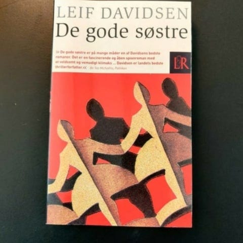 Leif Davidsen De gode søstre bog. Dansk roman i hardback-udgave med omslag i mørke nuancer. Bogen tilhører genren spændingsroman og er velegnet til læsere af moderne dansk skønlitteratur. Teksten er på dansk, og udgaven har trykt omslag med forfatter- og titelangivelse på forside og bagside.