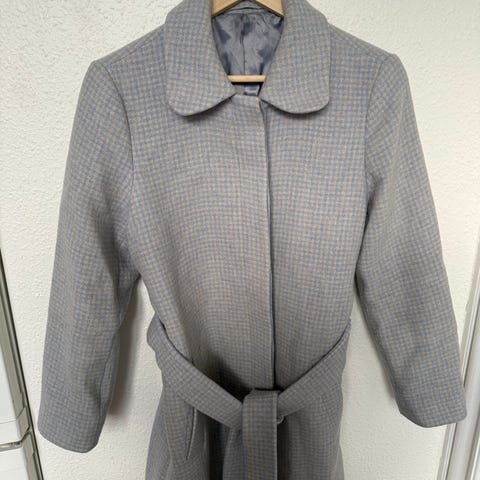 & Other Stories frakke til kvinder i str. M. Lang frakke i grå uldblanding med hvidt ternet mønster. Klassisk reverskrave, bælte i taljen og justerbare stropper ved ærmerne. Egnet som yderjakke i de køligere måneder.