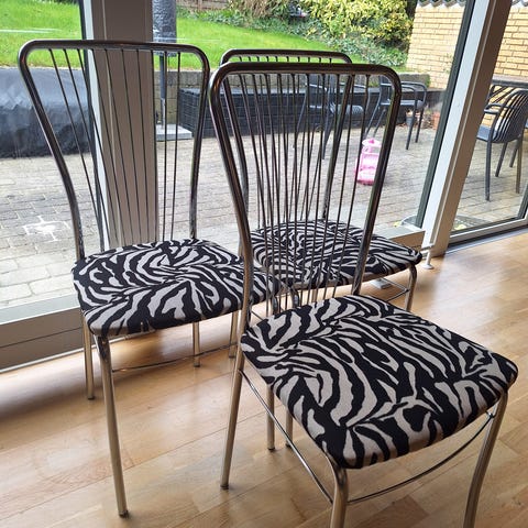 Sælger 4 flotte spisebordsstole med krom stel og nyompolstrede sæder i lækkert zebra-mønstret stof.