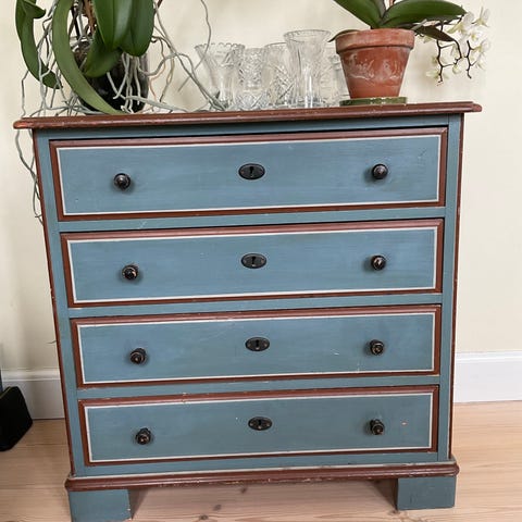 Almuebemalet kommode med 4 store skuffer, jernbeslag til at løfte og bære møblet. Kommoden befinder sig i Haslev