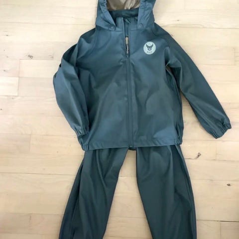 Wheat blåt regnjakke og regnbukser sælges. Bukserne har elastik og seler. Jakken har velcro i halsen så den lukker tæt.