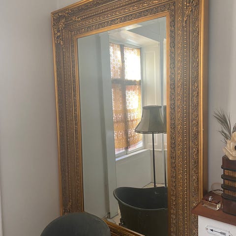 Rektangulært spejl med ornamenteret guldfarvet ramme. Spejlet har en profileret ramme med dekorerede hjørner og kan anvendes i eksempelvis entre, stue eller soveværelse som vægspejl eller dekoration.