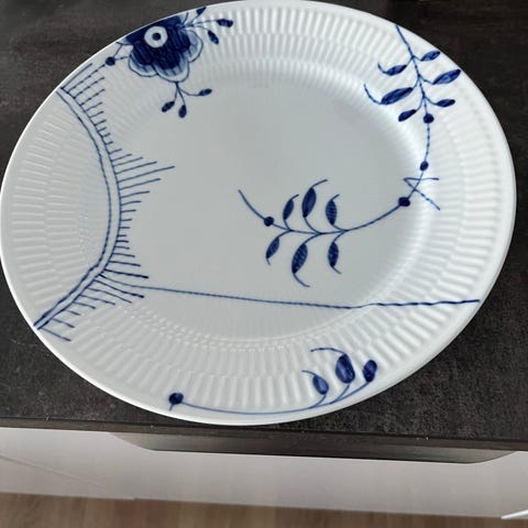 Royal Copenhagen tallerken i hvid porcelæn med blå, håndmalet dekoration. Klassisk riflede kanter og centralt blomstermotiv. Tallerkenen egner sig til servering af fx forret, dessert eller mindre anretninger og kan indgå som del af en større stel-samling fra Royal Copenhagen.