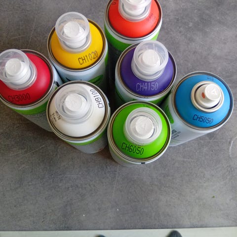 Spraymaling i forskellige farver. Flere dåser samlet i én kasse. Der er 55-57 dåser. Mere end halvdelen er aldrig brugt før, resten er mere end halvt fyldt.