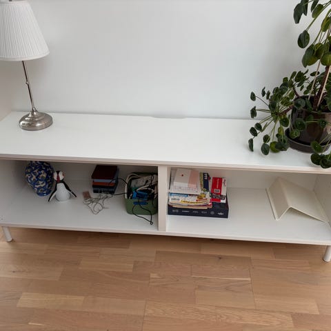 TV-bænk i hvid på hjul, ca. 13 år gammel. Er egentlig ganske velholdt, men har lidt pletter efter mange års brug - ingen ridser eller mærker. Har stået i ikke-ryger-hjem.
