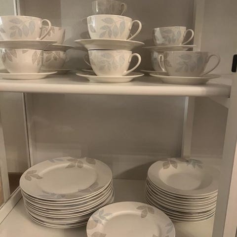 57 dele Stel i hvidt porcelæn med firkantede tallerkener og kopper med underkop. Tallerkenerne har let buede kanter og præget mønster langs kanten. Sættet omfatter flere størrelser tallerkener samt kopper med matchende underkopper i samme design. Velegnet som middagsstel, dessertstel eller til kaffe/te-servering.
