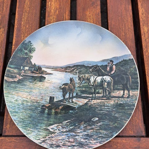 Lille platte fra Svane Porcelæn. Motivet er Hjerl Hede 1930-1980 Frilandsmuseet. Diameter 10 cm.