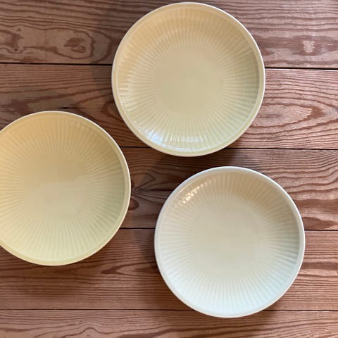 Der er enkelte mikro afslag i kanten eller under på nogle af tallerknerne. Se foto.