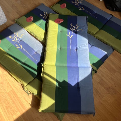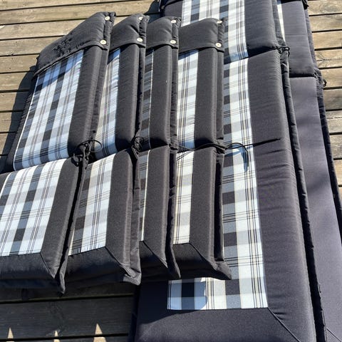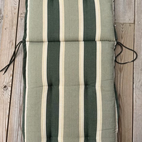 Havehyndesæt i grøn ternet tekstil. Hynderne er polstrede og har påsyede snore i siderne til fastgørelse på stol eller liggestol. Velegnet til brug i haven, på altan eller terrasse på havemøbler, hvor der ønskes ekstra sidde- og liggekomfort.