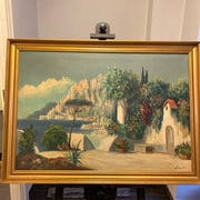 A. Boix maleri med kystlandskab. Motivet viser en bugt med blåt hav, klipper, bygninger og træer i forgrunden. Maleriet er udført med tydelige penselstrøg og stærke farver. Signaturen "A. Boix" ses i nederste hjørne. Maleriet er indrammet i en enkel, gylden ramme, som indgår som en fast del af værket.