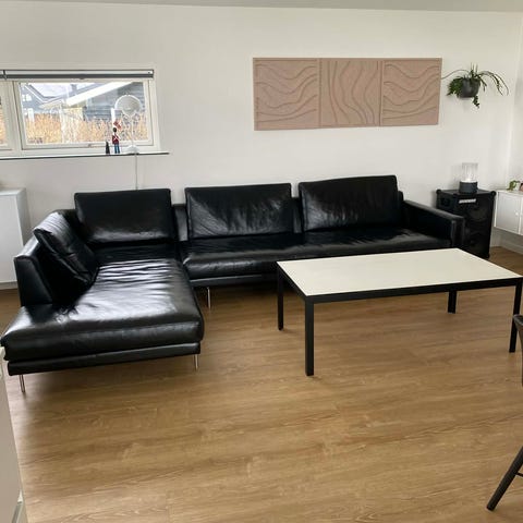 Super fin sofa i sort læder. Dunhynder i ryg.