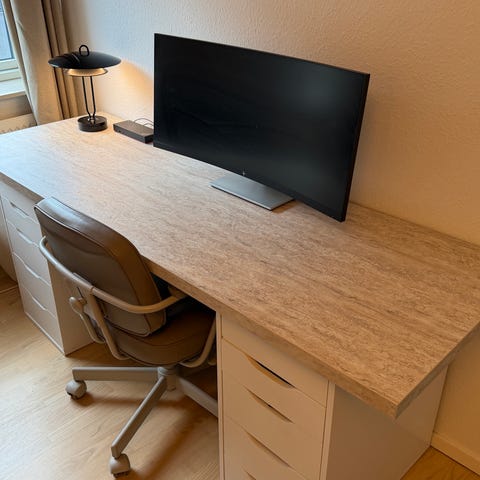 Skrivebord sat sammen af ikea elementer Alex skuffer og bordplader, kan evt sælges hver for sig og man er velkommen til at give et bud. Pladerne 2 stk er købt i ikea, 186x63,5x3,5 lagt ovenpå.
