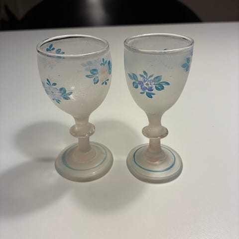 Sæt af 7 hvidvinsglas i klart glas med blå detalje på stilken. Glassene er ca. 17,8 cm høje.