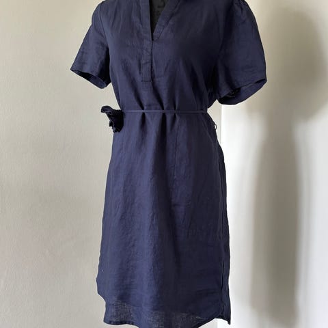 Designers Remix hverdagskjole i blå bomuld i størrelse 40. Kjolen har løs pasform med tilhørende bindebælte i taljen. Den har rund halsudskæring og knapdetaljer ved skuldrene. Ærmerne er halv-lange, og længden går cirka til knæet afhængigt af højde.