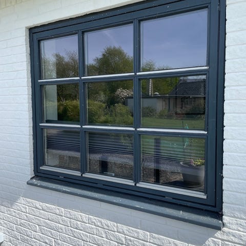 Vindue - hvidt trævindue med sprosser uden ramme.
