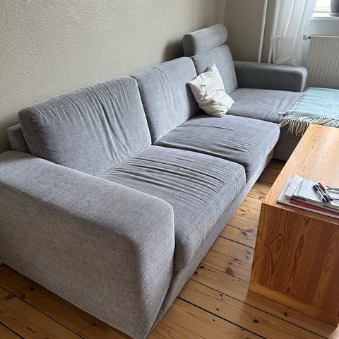 Venstre-drejet sofa med chaiselong, ret stor, i mørkt stof. Pudernes betræk kan tages af og vaskes. Jeg sørger for at rengøre inden den afhentes.