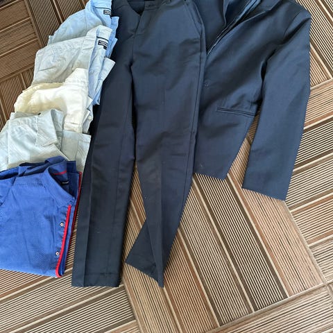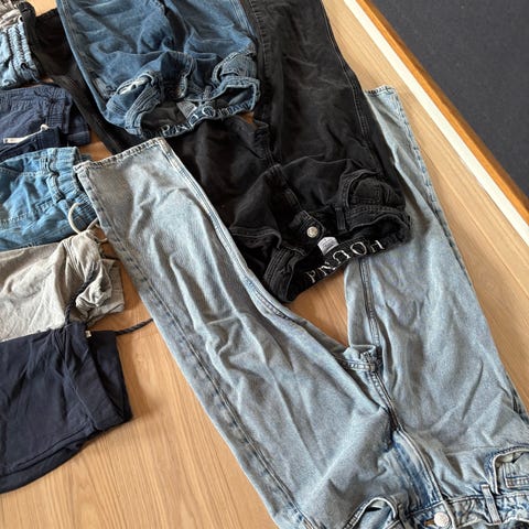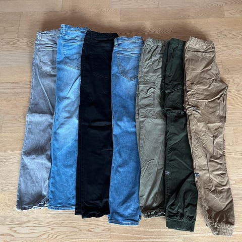 I alt 6 par jeans i forskellige farver og 3 par andre bukser (to sandfarvede og et par blå).