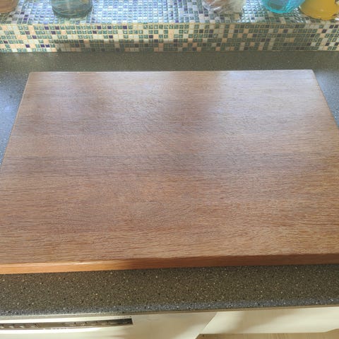 Virkelig flot skærebræt i massivt egetræ med dyb saftrille. Brugt og med synlige brugsspor, men uopslideligt....