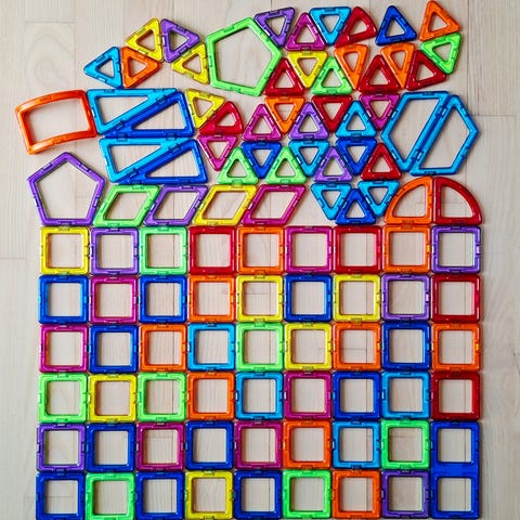 Magformers samlet sæt med 195 dele i forskellige magnetiske former, som kan sættes sammen på alle tænkelige måder.