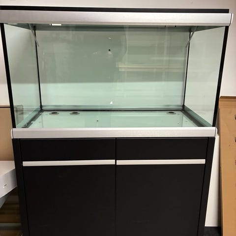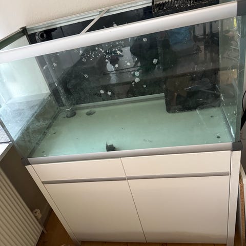 Akvarium med tilhørende underskab med vand skader og aqua light LED-belysning der mangler strømforsyninger har en del risser også nogen der er synlige når der er vand i. Baggrunden er der i men der er ingen filter materiale med.